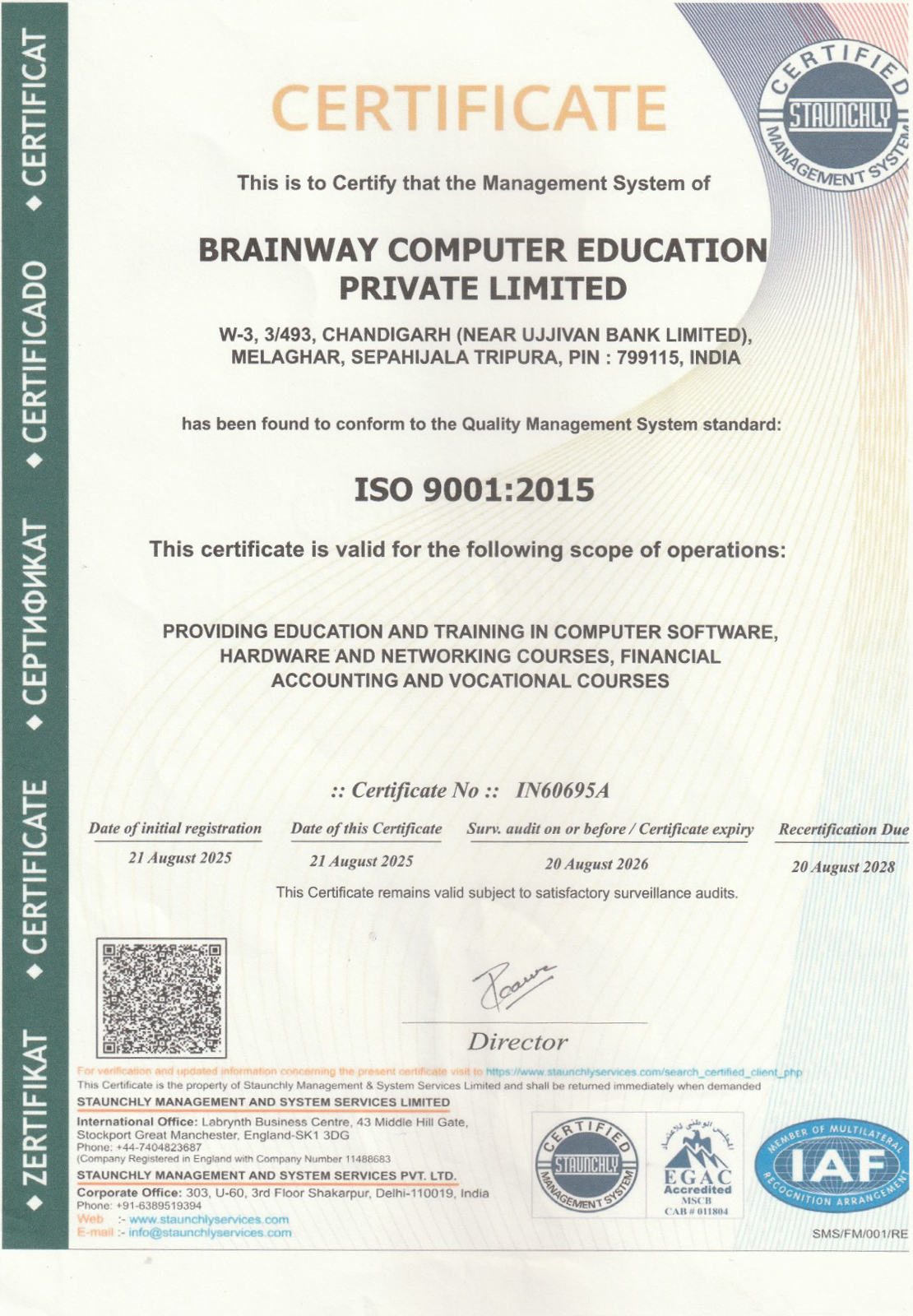 BRAINWAY COMPUTER EDUCATION PVT. LTD. is An ISO 9001:2015 certified Institution. In this era of globalization the need fullness of computer education can hardly be over emphasized. The BRAINWAY is now hell - bent upon spreading its wings through franchisee throughout the length and breadth of the country. We have international level syllabus like Software, Hardware, Website Development, Accounting, Multimedia & Animation and Networking, CAD, Mobile Technology, Spoken English, Data Entry and E-Typing Programs and flexible course materials (instructional materials which are prepared with meticulous care by experts and experienced scholars for the accessibility of the learners in general. Training is conducted in comfortable and spacious labs equipped with computers which are constantly updated with the latest technology. Affordable fees structure along with easy installment facilities tends to make our courses reachable to all. The dedicated and qualified faculty member of the BRAINWAY are always keen on guiding the students aright so that they can get placement opportunities in reputed companies after the completion of the course.