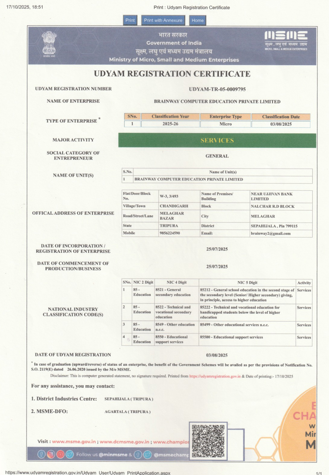 BRAINWAY COMPUTER EDUCATION PVT. LTD. - the Leading Computer Training institute was established in the year 2014 as Resistered By Society Registration Act. Govt. of Tripura also registered under MSME Govt. of India and BRAINWAY COMPUTER EDUCATION PVT. LTD. Centre is a quality Education Provider. BRAINWAY COMPUTER EDUCATION PVT. LTD. is established for the spread of Computer Education all along the line our institute has embarked on the computer program broad-based on the concept of Information and communications Technology. The BRAINWAY COMPUTER EDUCATION PVT. LTD. is trying their hardest to boost up computer learning at all levels of human activity with the help of a band of skilled and experienced professionals. Right now BRAINWAY is not only a single unit but it has flourished into a Group of institutions. In a single sentence...